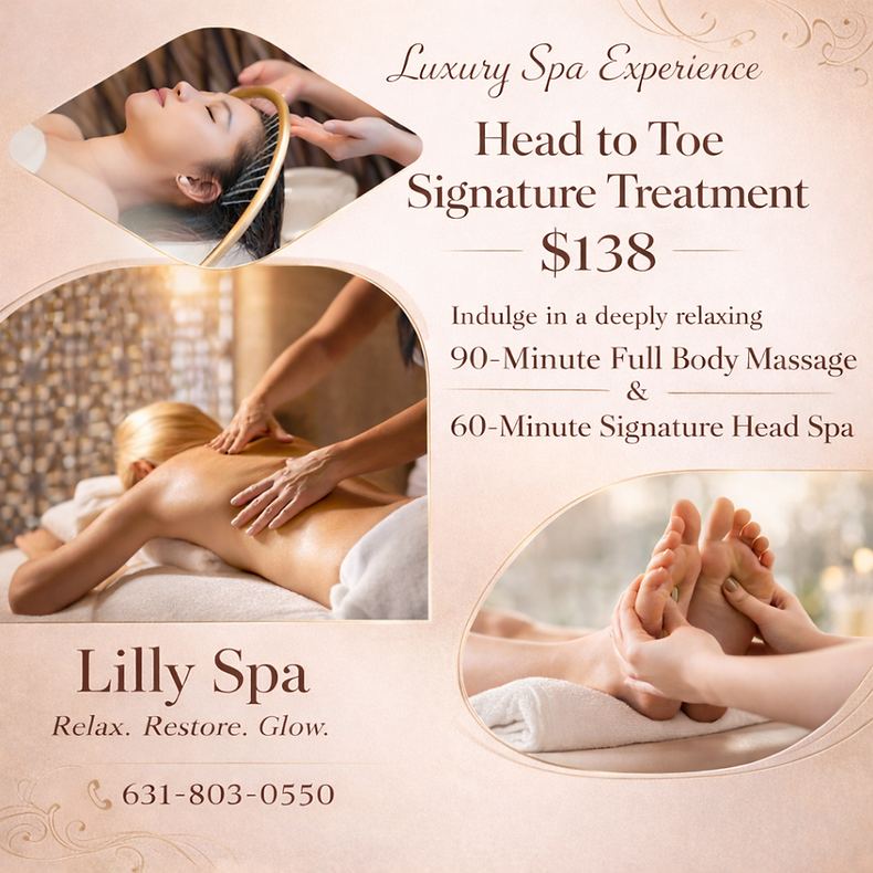 Your technicians at Lilly Spa is customized to relax and peace your body and mind, whose technique will be uniquely tailored to fit your inner body. You’ll quickly unwind and relieve any built-up stress you may have from your work and home. We invite you to reach your goals of stress reduction, relaxation and pain relief, combined with our skillful bodywork and rejuvenating methods. We also offer couple and group sessions to enjoy with your loved ones and friends. You are welcome to call us at 631-803-0550 to make appointment! We are looking forward to serve you. Thank you!